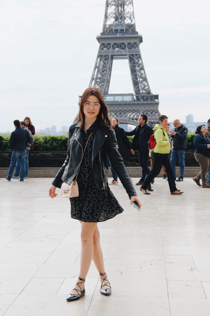 Эта поездка в Париж вдохнула в меня мотивацию и вдохновение работать усерднее и брать от жизни по-максимуму. Поэтому я думаю, что этот наряд очень даже символичный: парижская элегантность в форме расслабленного платья-рубашки, остроносых балеток и моей любимой сумки + принт со звёздами. Платье, кстати, стало теперь моим любимым, так как, во-первых, его можно включать как в повседневной гардероб с балетками или кроссовками, так и надеть лодочки и выйти куда-нибудь вечером. А во-вторых, это стопроцентная вискоза, так что чувствуешь себя в нем максимально комфортно.